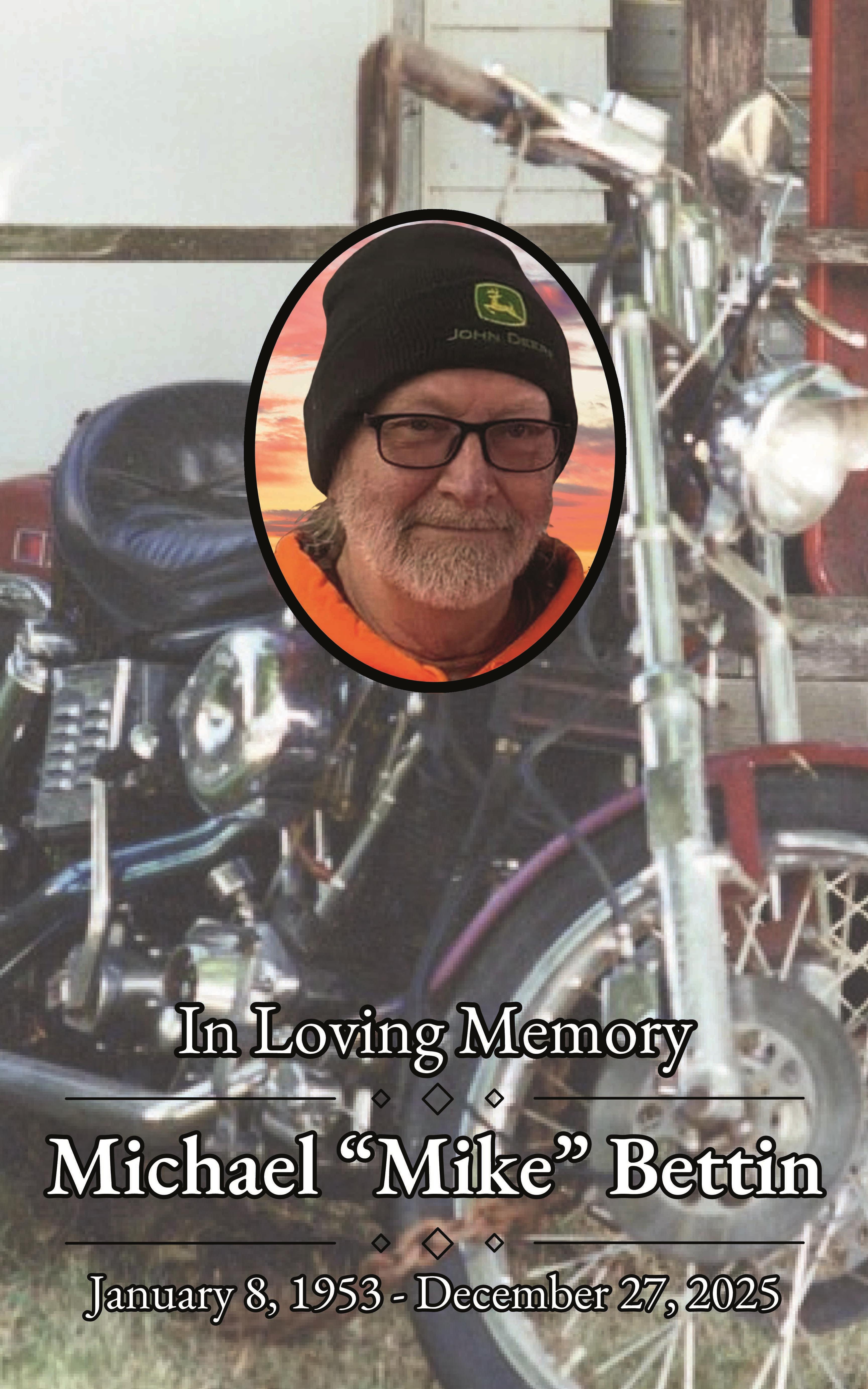 MOUNTAIN LAKE - Michael E. "Mike" Bettin, age 72, of Mountain Lake, MN, passed away peacefully surrounded by his family on Saturday, December 27, 2025, at his home in Mountain Lake.