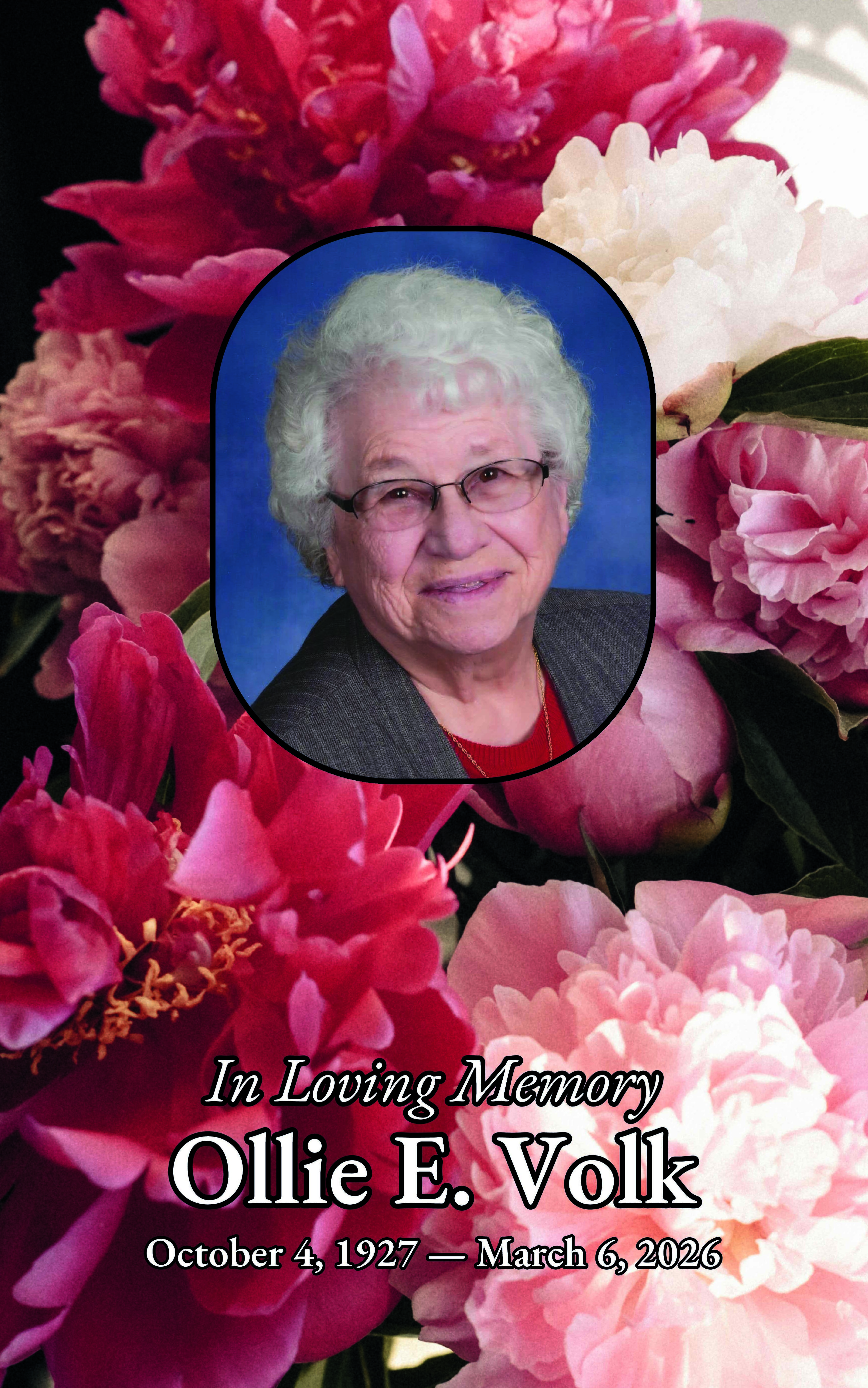 Visitation will take place from 4:00 PM – 7:00 PM on Monday, March 16, 2026, at the Lutheran Church of Our Savior in Windom (1157 3rd Avenue, Windom, MN 56101). Visitation will also take place from 9:30 AM – 11:00 AM prior to the service at the church on Tuesday. Olive will be buried at Lakeside Cemetery in Heron Lake, next to her husband, Bernard “Bud” Volk.